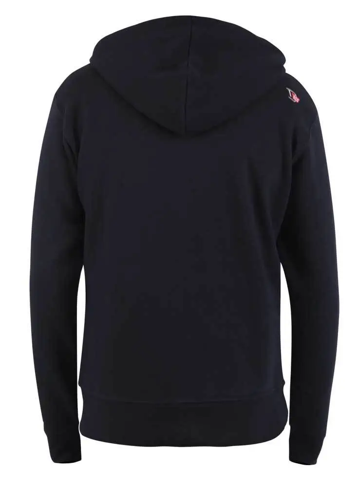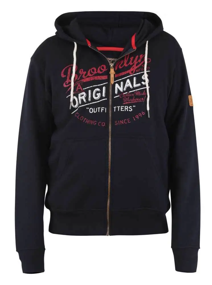 Navyblå sweatshirt til den høje mand, med gennemgående lynlås og hætte. Trøjen er fra D555 og har en dejlig blød inderside. Der er snore i hætten og tryk på forsiden.