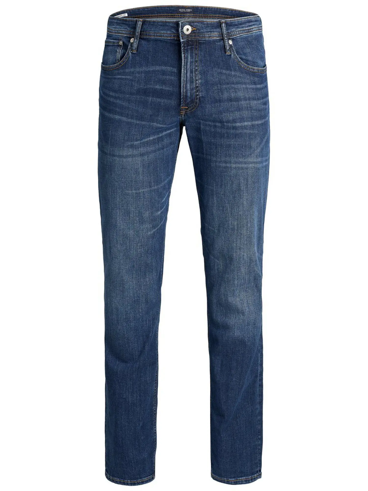 Blå denim jeans fra Jack & Jones. Disse jeans har fem lommer, to baglommer og to lommer foran + en lille penny-pocket. Bukserne lukkes med knap og lynlås og så har de bæltestropper.