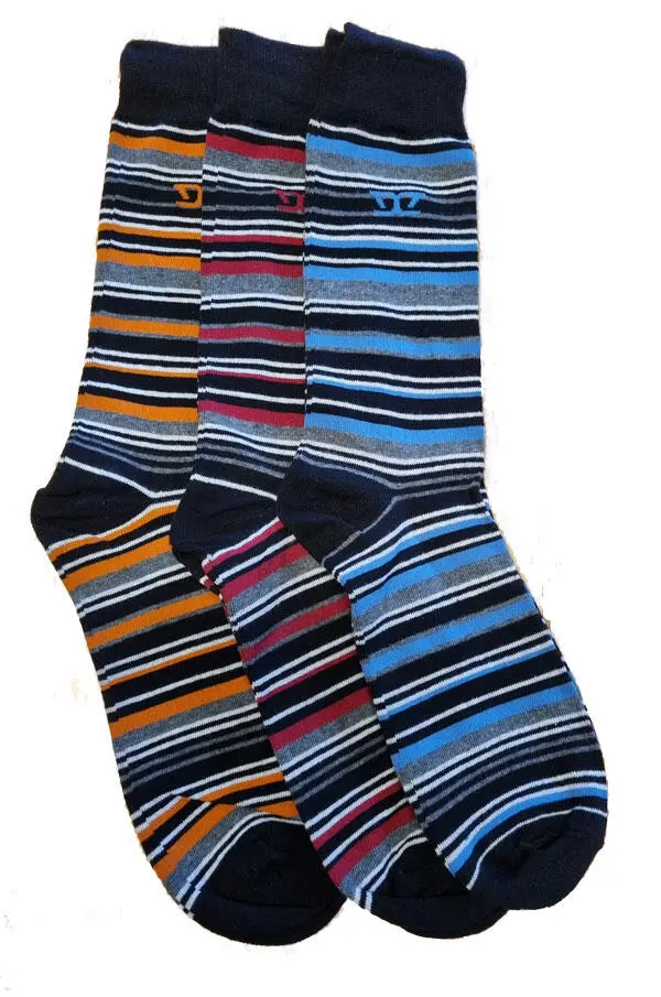 Det ene par strømper er sort/blå/grå og hvid, det andet par er sort/orange/grå og hvid og det tredje par er sort/rød/grå og hvid.