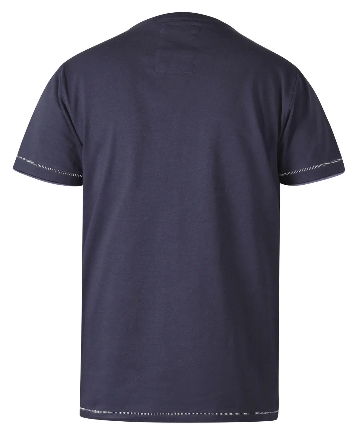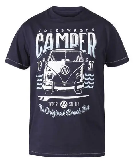 Navyblå T-shirt fra D555 med ekstra længde, til den høje mand. T-shirten har et tryk med en folkevogn og teksten 'Volkswagen Camper 1950, The Original Beach Bus' som står med blå og hvid tekst.