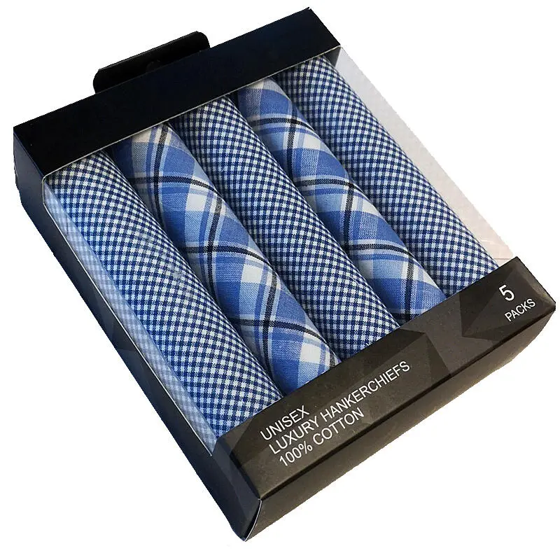 5 stk. pakning med luksus lommetørklæder med tern og striber i blå nuancer og hvid.