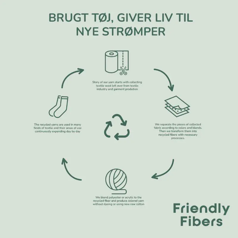 Strømperne er produceret med 80% genanvendt bomuld, som kommer fra tekstilproduktionernes rester.