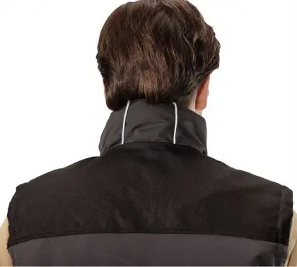 I taljen er der et snore-træk så du kan stramme den ind. Vesten lukkes med lynlås og der er en stolpe som skjuler lynlåsen og så lukkes med velcro, så der kommer ikke luft ved lynlåsen. Vesten er glat på indersiden, så den er nem at tage af og på. Arbejdsvesten er med for.