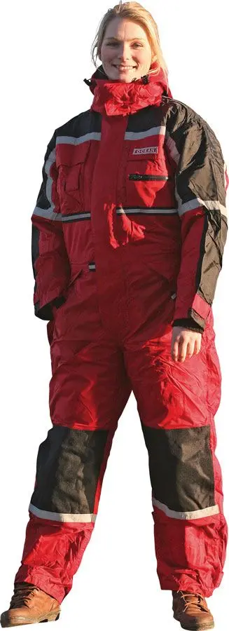 Rød/sort termokedeldragten er en heldragt med aftagelig komforthætte. Den er med tovejs lynlås og velcrolukket overfald på fronten. Taljelang tovejs lynlås langs sidesømmene på benene.