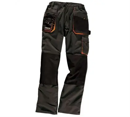 I taljen er der elastik i siderne for ekstra komfort. Arbejdsbukserne er sorte og har bæltestropper, de lukkes med lynlås og knap.