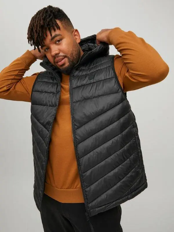 Sort vatteret vest fra Jack & Jones. Vesten er med hætte og har gennemgående lynlås. Der er to store udvendige lommer samt to store og dybe indvendige lommer.