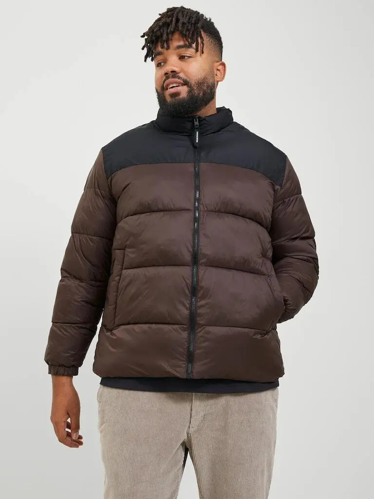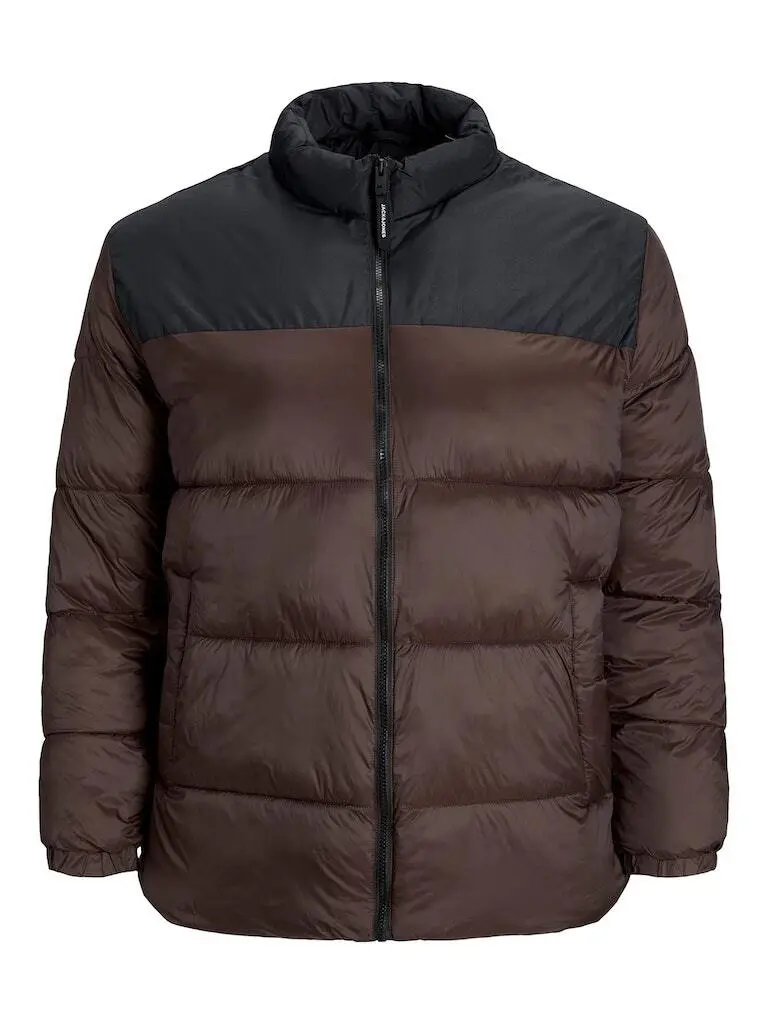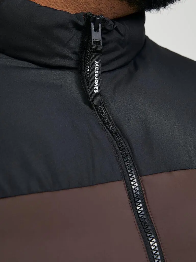 Let dynejakke i brun og sort. Jakken er gennemlynet og har en høj krave. I ærmerne er der elastikkantbånd.