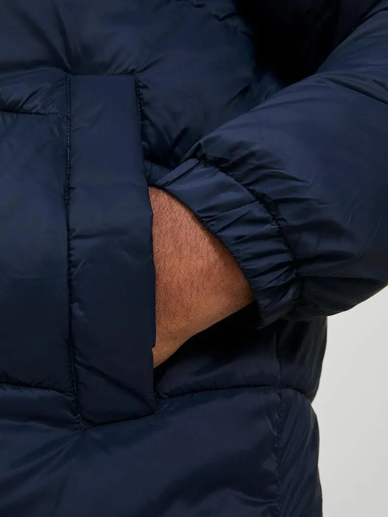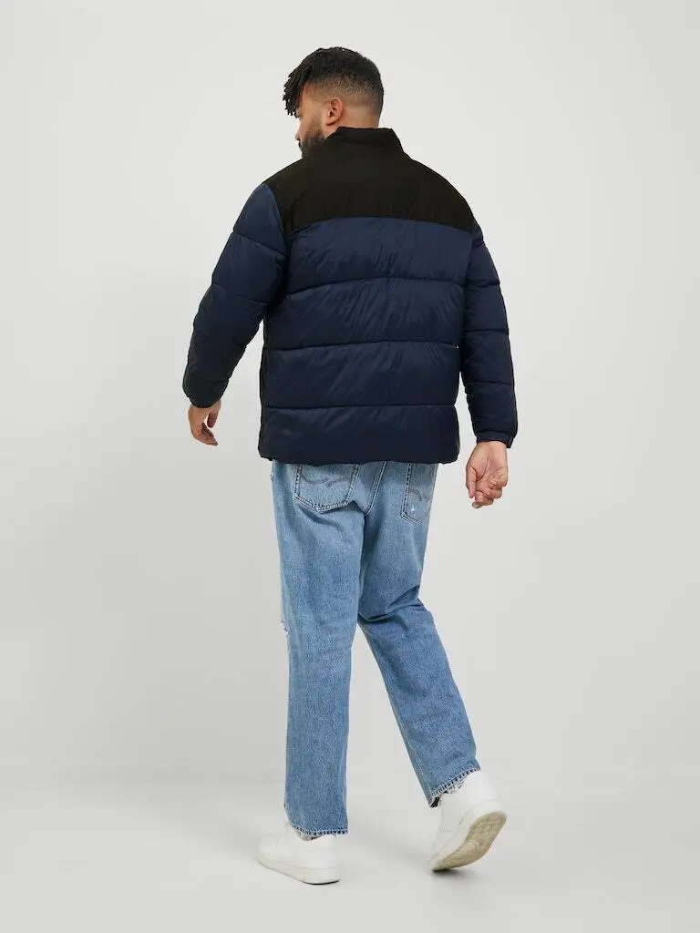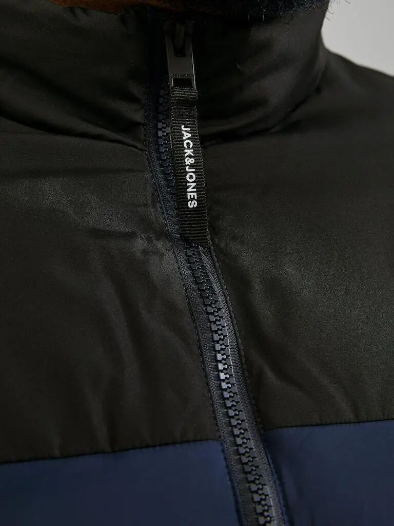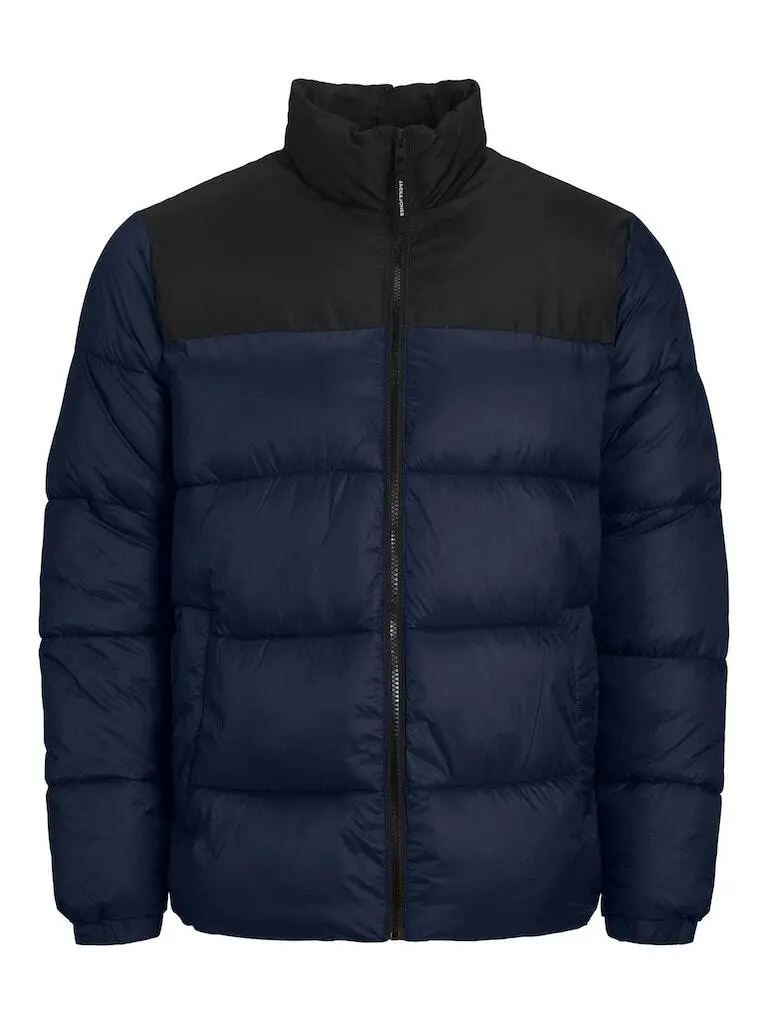 Let dynejakke i navyblå og sort. Jakken er gennemlynet og har en høj krave. I ærmerne er der elastikkantbånd.