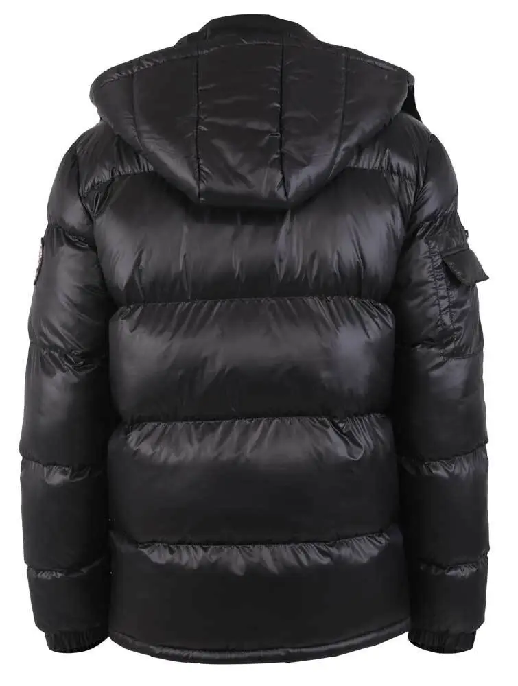 Sort dynejakke med hætte og gennemgående lynlås fra D555. Jakken har en meget glat og skinnende overflade, både indvendigt og udvendigt. Jakken er foret med polyester-fyld.