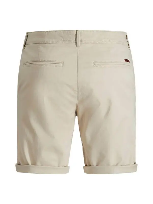 Lys sand chino shorts fra Jack & Jones. Shortsene er en blanding mellem en formel og en afslappet 5-lomme-stil. Der er to baglommer og tre lommer foran.