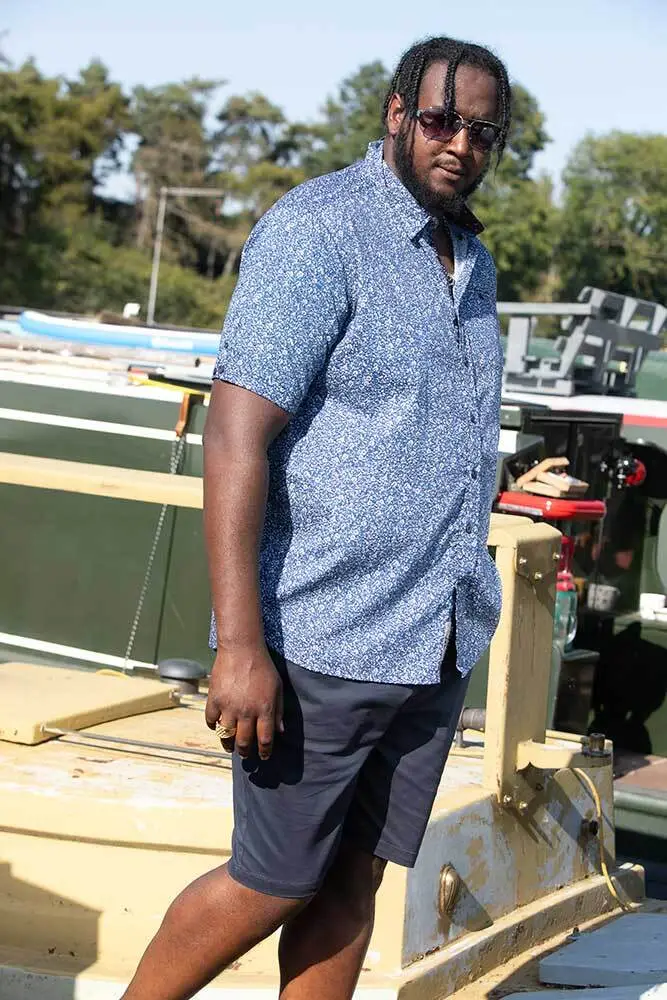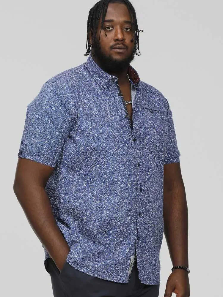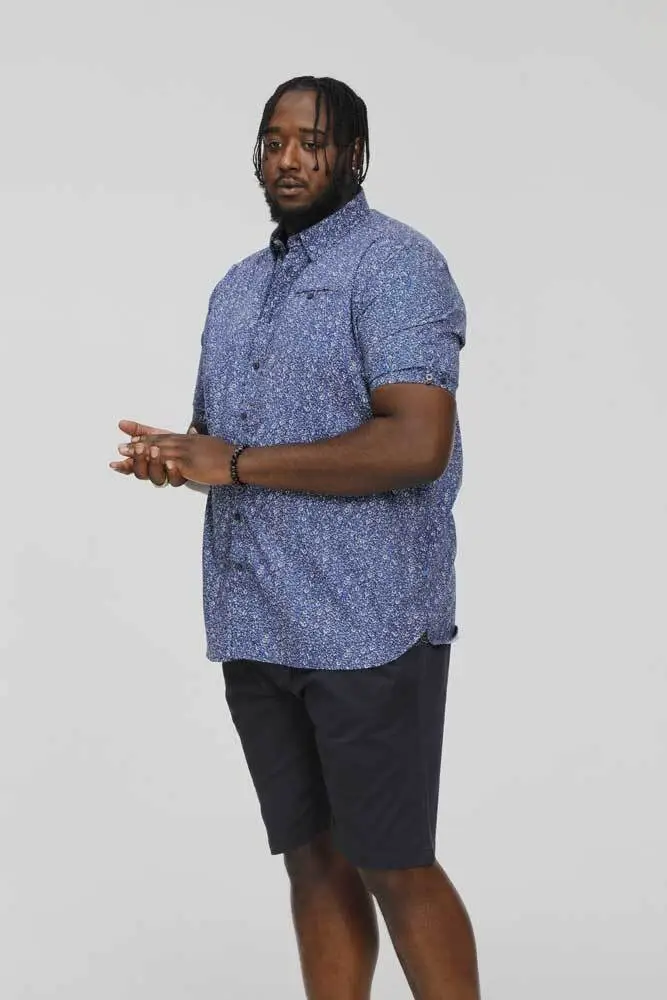 Blå kortærmet skjorte med flot all-over print i sort og hvid.