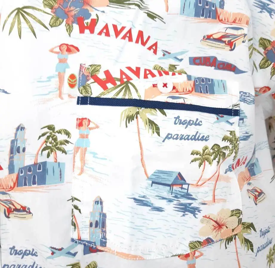 Skjorten har blå kontrast på ærmerne, på lommen og i kraven. På skjorten er der Havana print med bl.a. biler, damer og tropiske blomster.