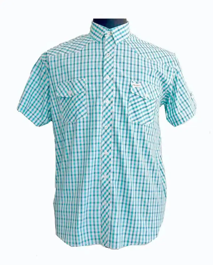 Skjorten er ternet i hvide, blå og grønne nuancer. Farverne kan være svære at gengive på billeder men farverne er ramt bedst på close-up billedet af lommen.