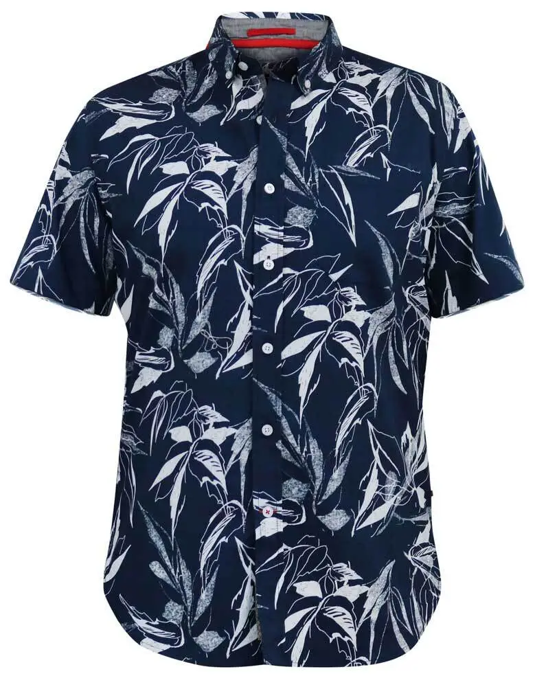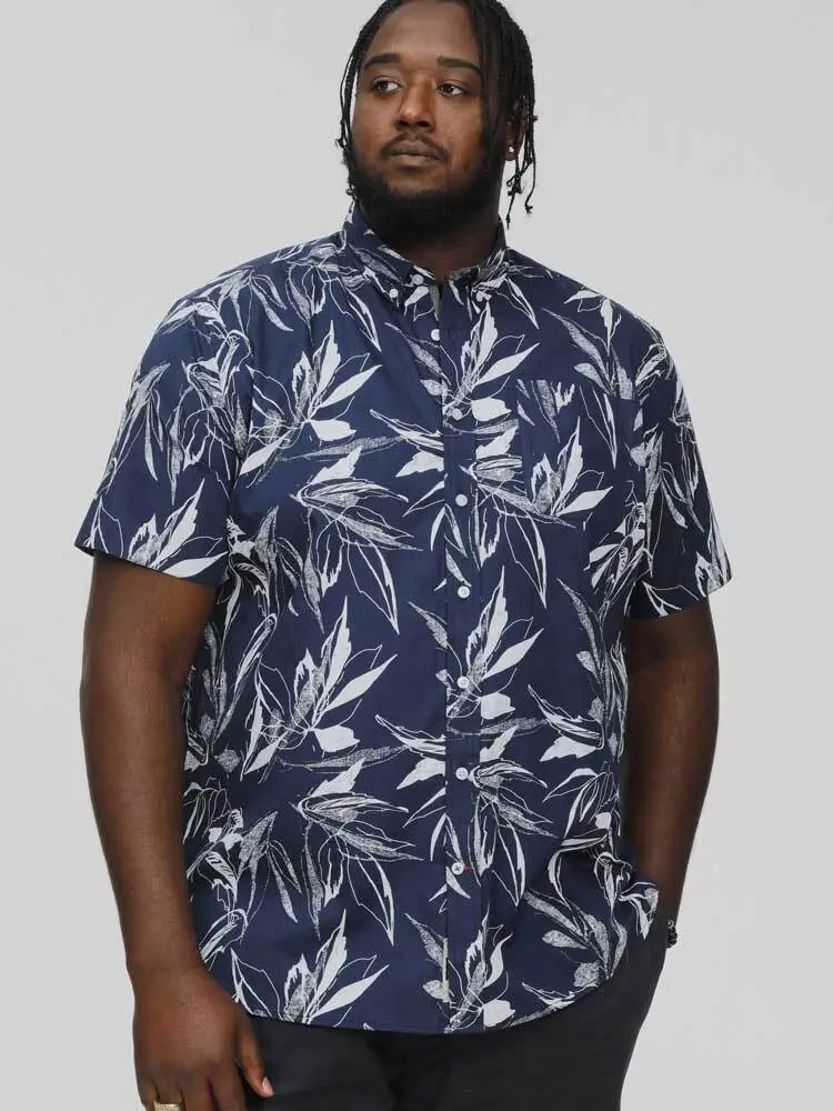 Blød og åndbar navyblå kortærmet skjorte med et elegant mønster af forskellige blade i hvid, som træder smukt frem på den mørke baggrund.