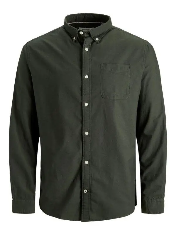 Grøn Oxford skjorte med lange ærmer fra Jack & Jones. Skjorten er med botton-down, så kraven bliver holdt pænt på plads. Der er en brystlomme i venstre side.