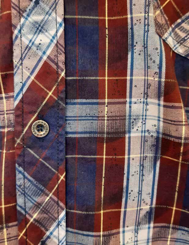 I venstre side er en brystlomme, som lukkes med knap. Skjorten har knapper i manchetterne og en klassisk krave.
