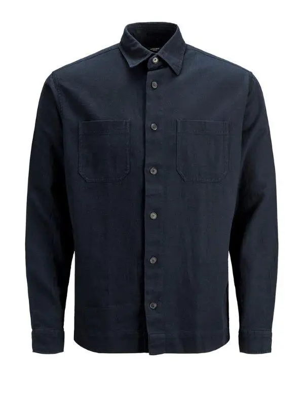 Navyblå langærmet skjorte fra Jack & Jones i kraftig kvalitet. Denne type skjorte kaldes også en overshirt eller skjortejakke, da den både kan bruges som skjorte og som jakke.