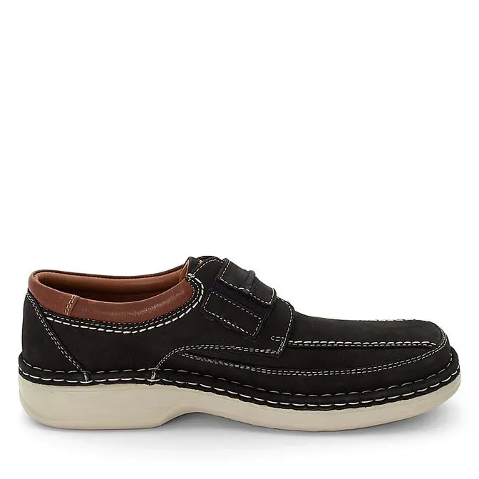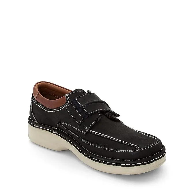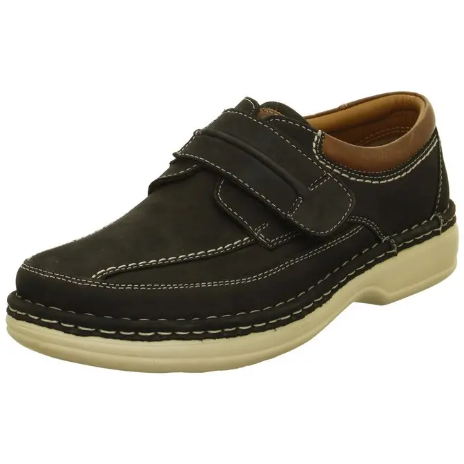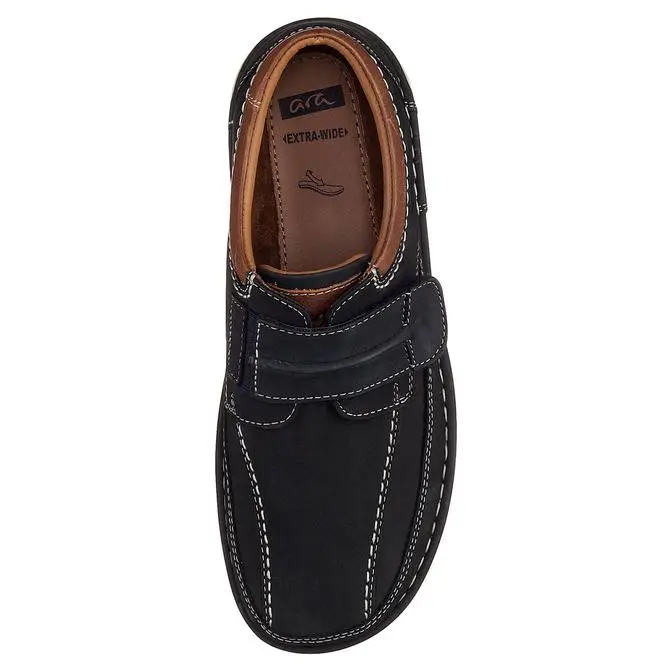 Klassisk navyblå nubuck sko til herrer, fra Ara, med en bred velcrorem, så skoen næsten kan åbnes helt op og bliver nem at træde ned i.