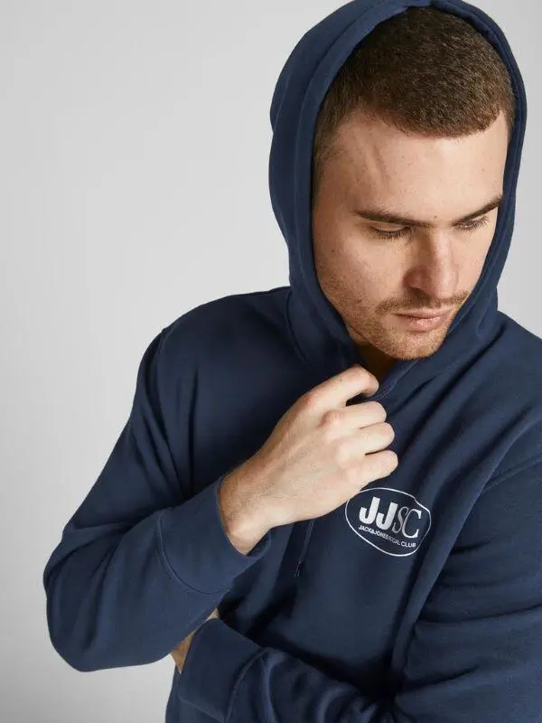 Superblød navyblå hættetrøje fra Jack & Jones. Trøjen har en dejlig kængurulomme til kolde hænder. Der er snoretræk i hætten og ribkant i bunden af trøjen.