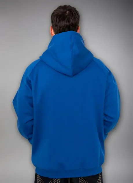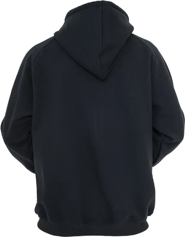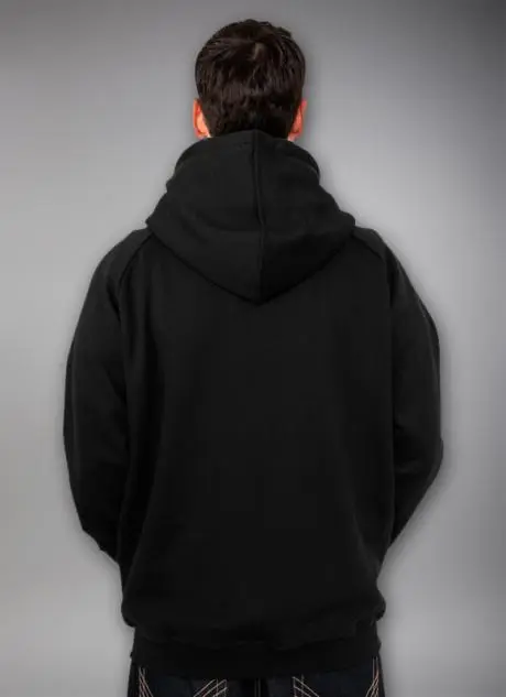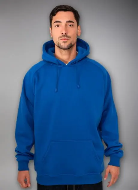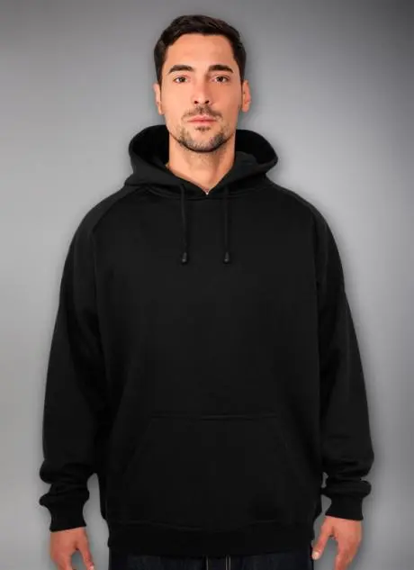 Der er ribkant i ærmerne og forneden, og hættetrøjen har "kænguru-lomme" foran.