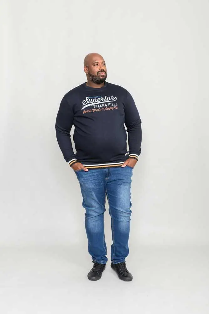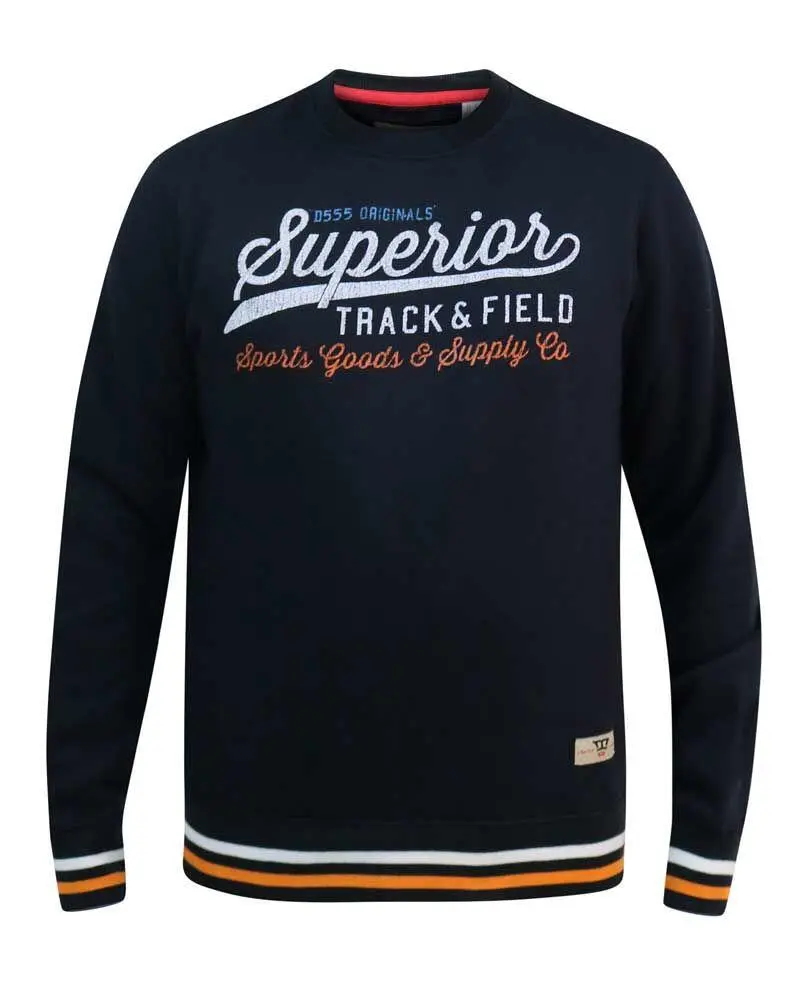 Navyblå sweatshirt med rund hals fra D555. Sweatshirten har et tryk på brystet, hvor der bl.a. står "Superior Track And Field".