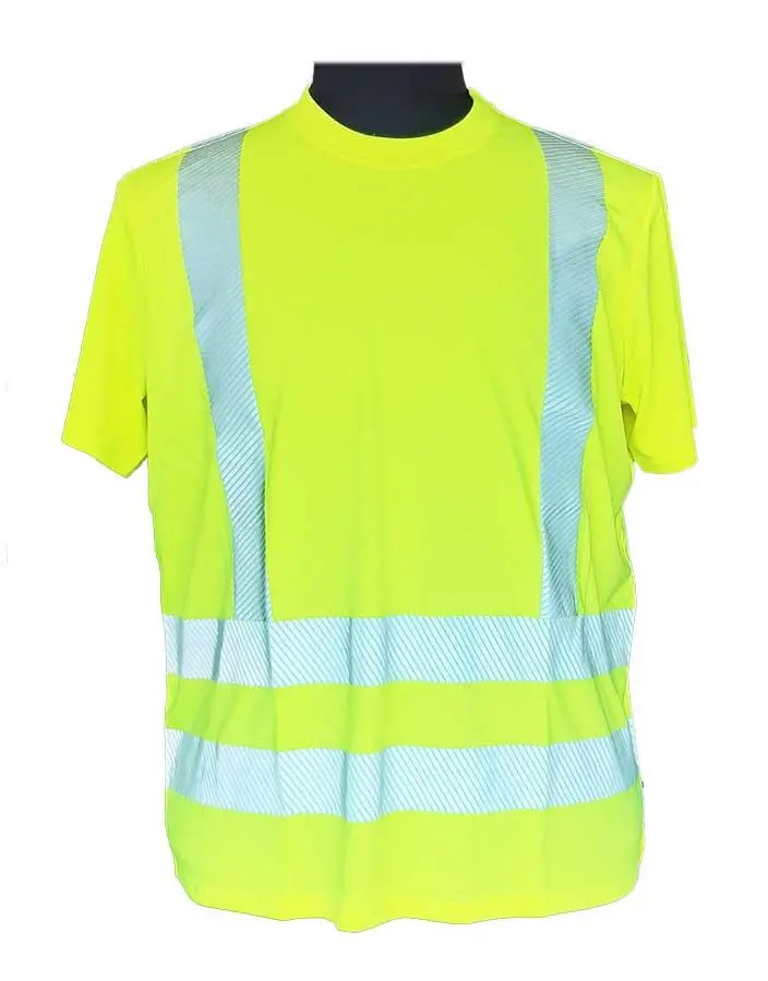Gul refleks T-shirt til arbejdsbrug fra Marc & Mark. T-shirten har refleksstriber både foran og bagpå, så du er synlig for dine omgivelser. Den er lavet af antibakteriel og svedtransporterende polyester mesh.