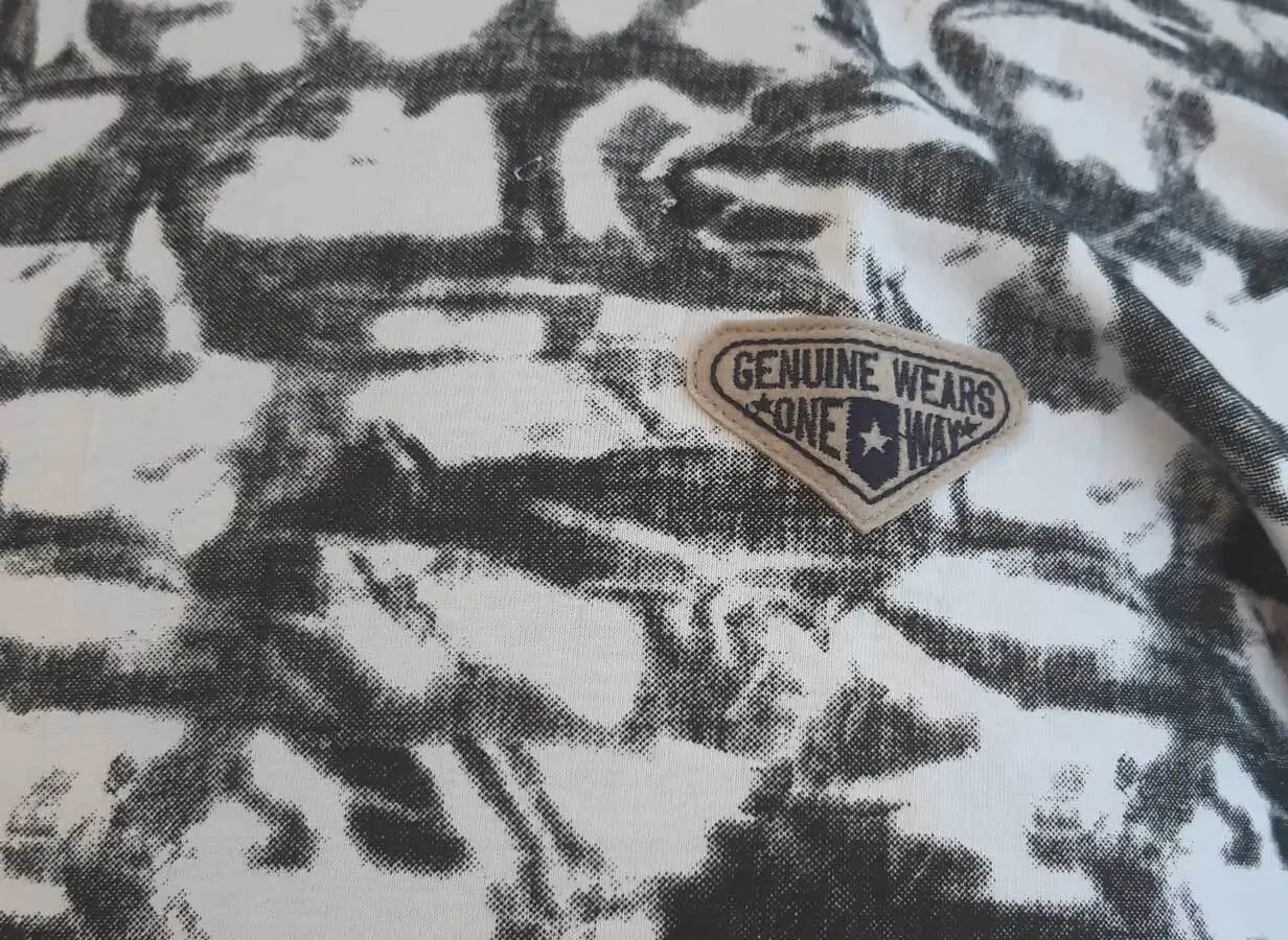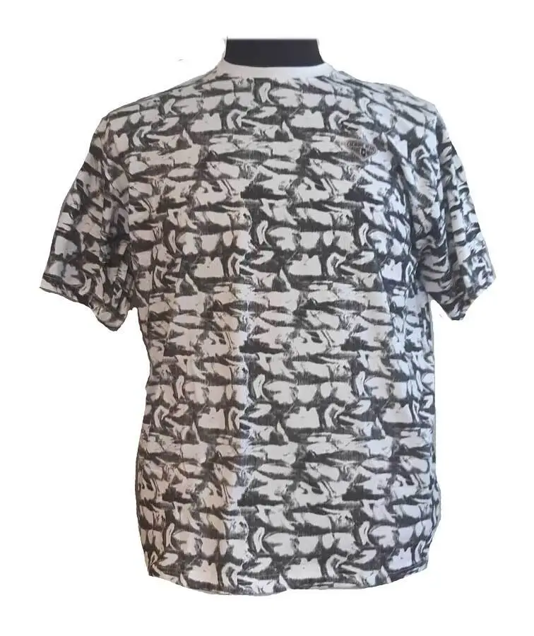 Hvid T-shirt fra Kamro. T-shirten har et gråt batik-lignende mønster, som giver spil i T-shirten.