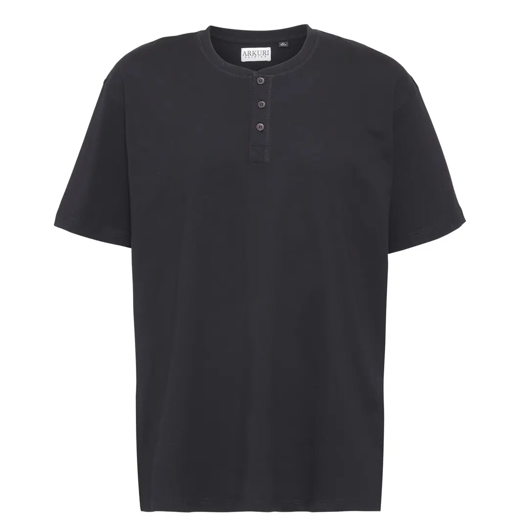Sort, blød og lækker Grandad T-shirt med korte ærmer og rund-hals. Grandad T-shirten har 3 matchende knapper i stolpelukningen.