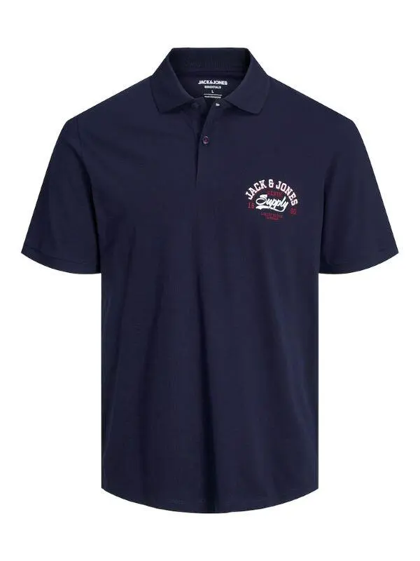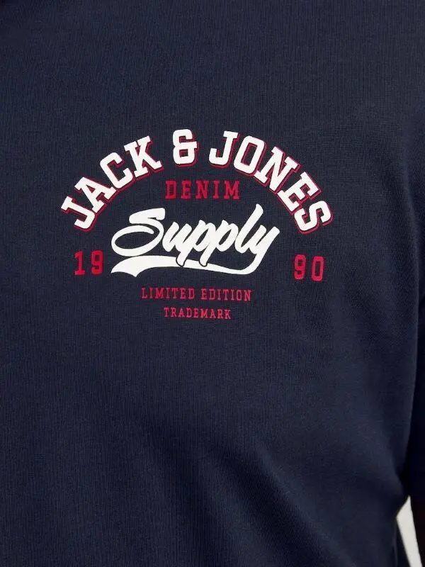 Mørkeblå polo-shirt med gummitryk på venstre bryst. Trykket er i rød og hvid, og der står blandt andet "Jack&Jones", "Denim - Supply".