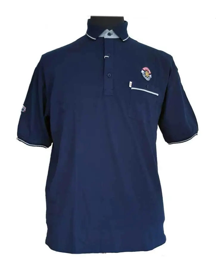Navyblå polo-shirt fra Kamro. Denne polo har en brystlomme i venstre side med knaplukning. Der er to badges, den ene sidder over brystlommen og den anden sidder på højre ærme.