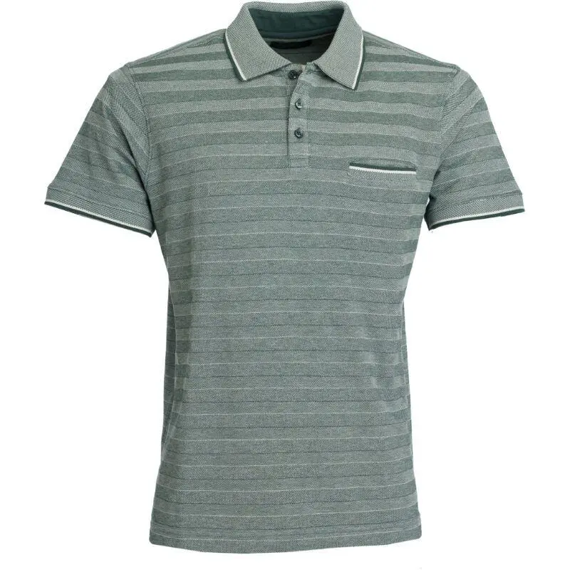 Traditionel polo-shirt med brystlomme og tre grønne knapper ved halsudskæringen. Poloen er designet med striber, der skaber en optisk illusion af relief, hvilket tilføjer en interessant detalje til denne ellers neutrale polo-shirt i en charmerende støvet grøn nuance.
