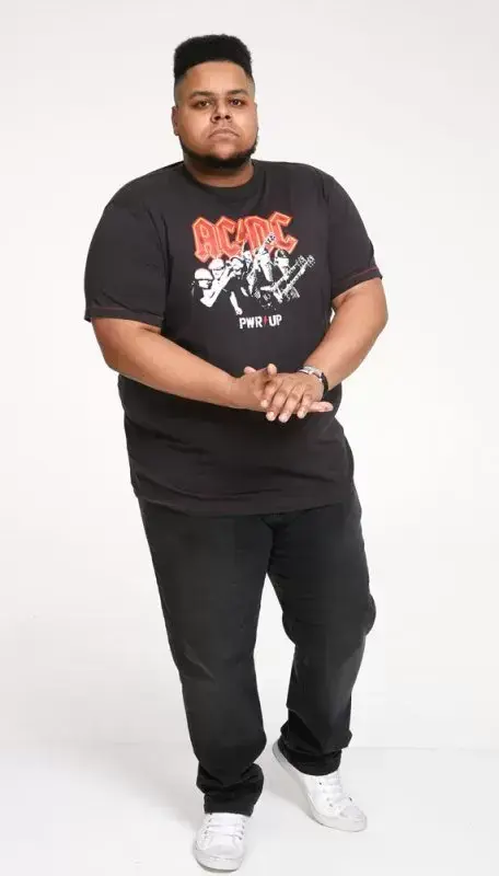 Fed rå idol T-shirt, med AC/DC logo i rødt, nedenfor er der et sort/hvidt print af Brian Johnson og Angus Young, samt teksten "PWR / UP".