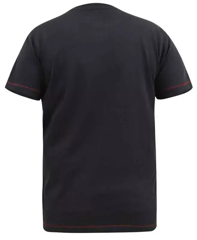 T-shirten har røde stikninger i bunden og i ærmegab.