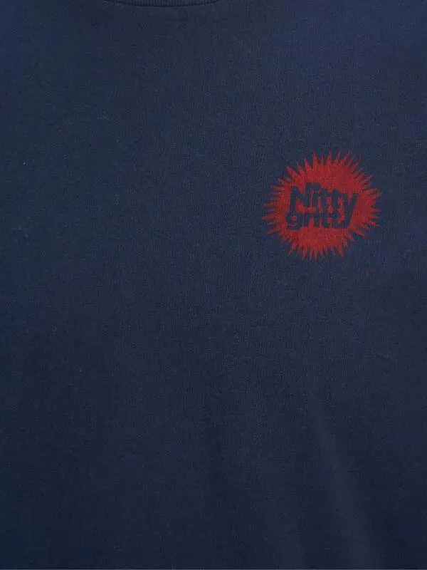 T-shirten har et stort firkantet 'Nitty Gritty' tryk på ryggen, som ligner en reklame med et lettere slidt udtryk. Trykket har fremtrædende farver som gul, blå og rød. På forsiden er et lille rødt 'Nitty Gritty' logo.