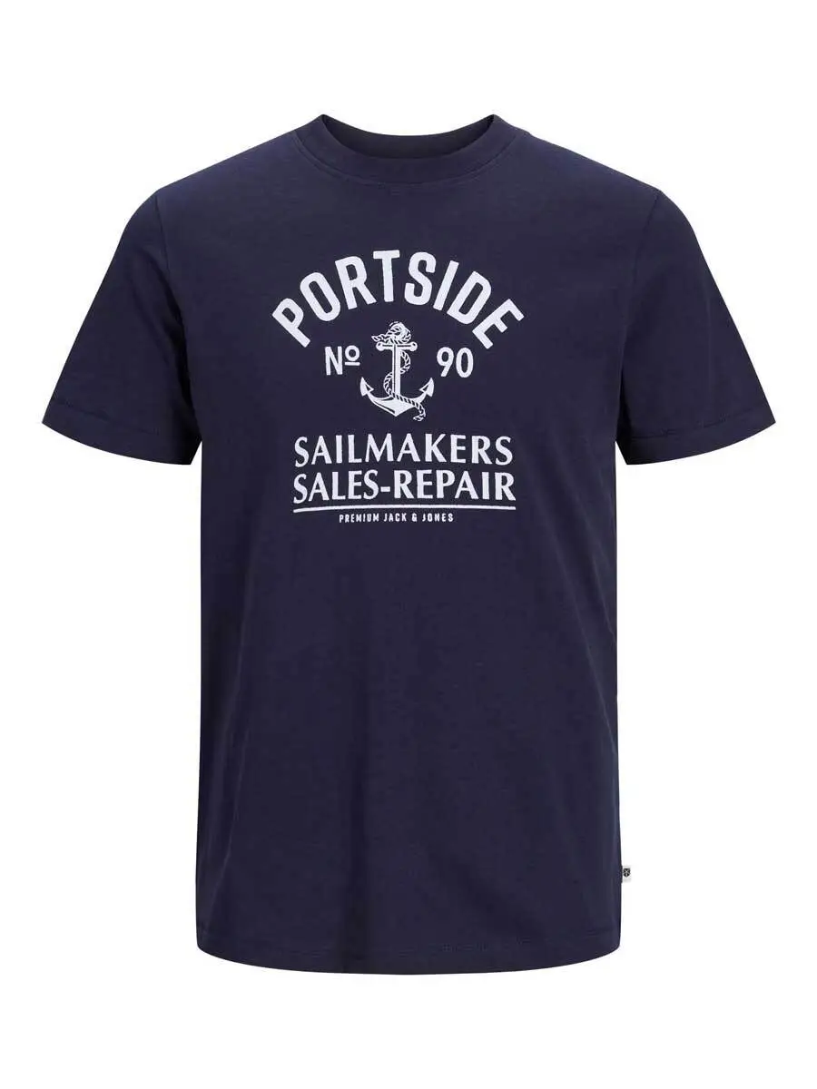 Navyblå T-shirt med "Sailor" print fra Jack & Jones. På T-shirten er der et print med et hvidt anker omviklet af et reb. Der er desuden hvid tekst med "Portside" over billedet af ankeret. Ved ankeret står der "no 90". Under billedet står der "Sailmakers" og "Sales - repair" samt "Premium Jack & Jones".
