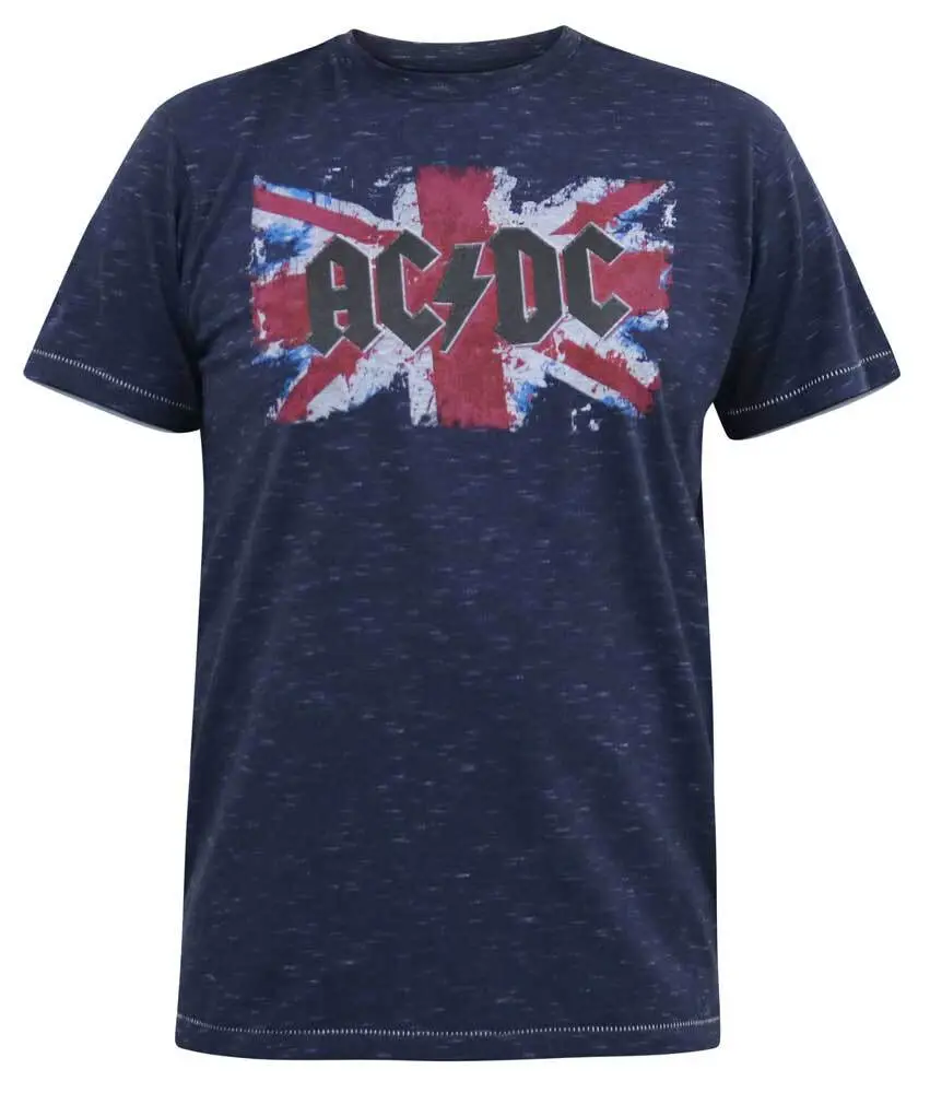 En rå navymeleret statement T-shirt, der er en tidløs hyldest til rock med et autentisk "AC/DC" logo i vintage-look, der komplimenteres i baggrunden af det britiske flag, i et krakeleret udtryk.