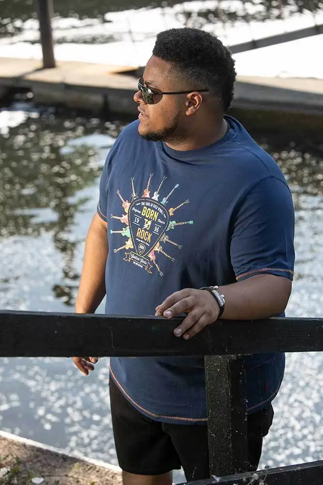 Denne navyblå rundhalsede T-shirt er et absolut must for den moderne mand, der har en passion for rock 'n' roll.