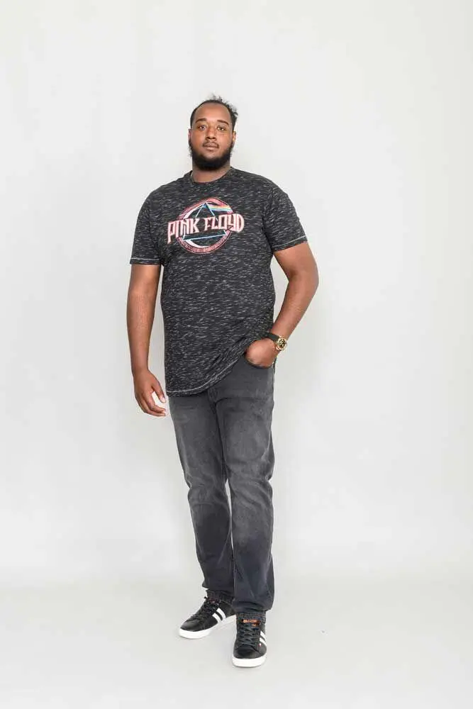 Sort T-shirt fra D555. T-shirten har et stort "Pink Floyd" tryk i mange farver.