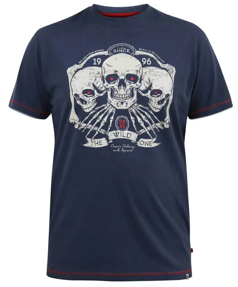 Støvet blå T-shirt med "trio af skelethoveder" print - D555