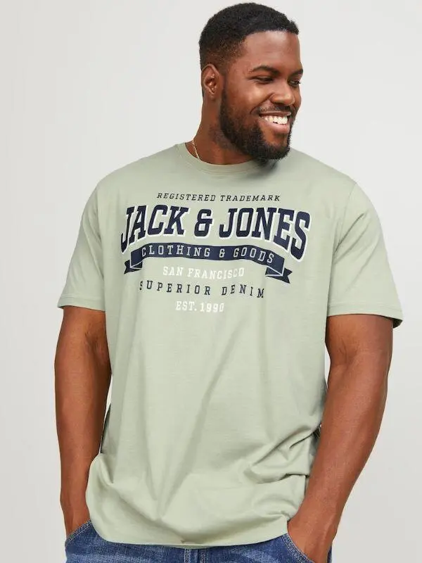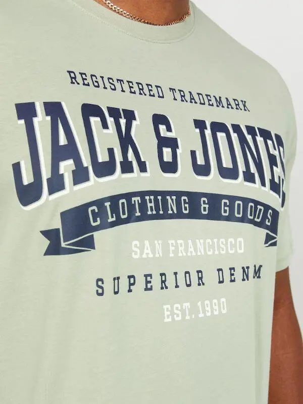 På T-shirten står der blandt andet skrevet "Jack & Jones - Clothing & Goods", "San Francisco", "Superior Denim".