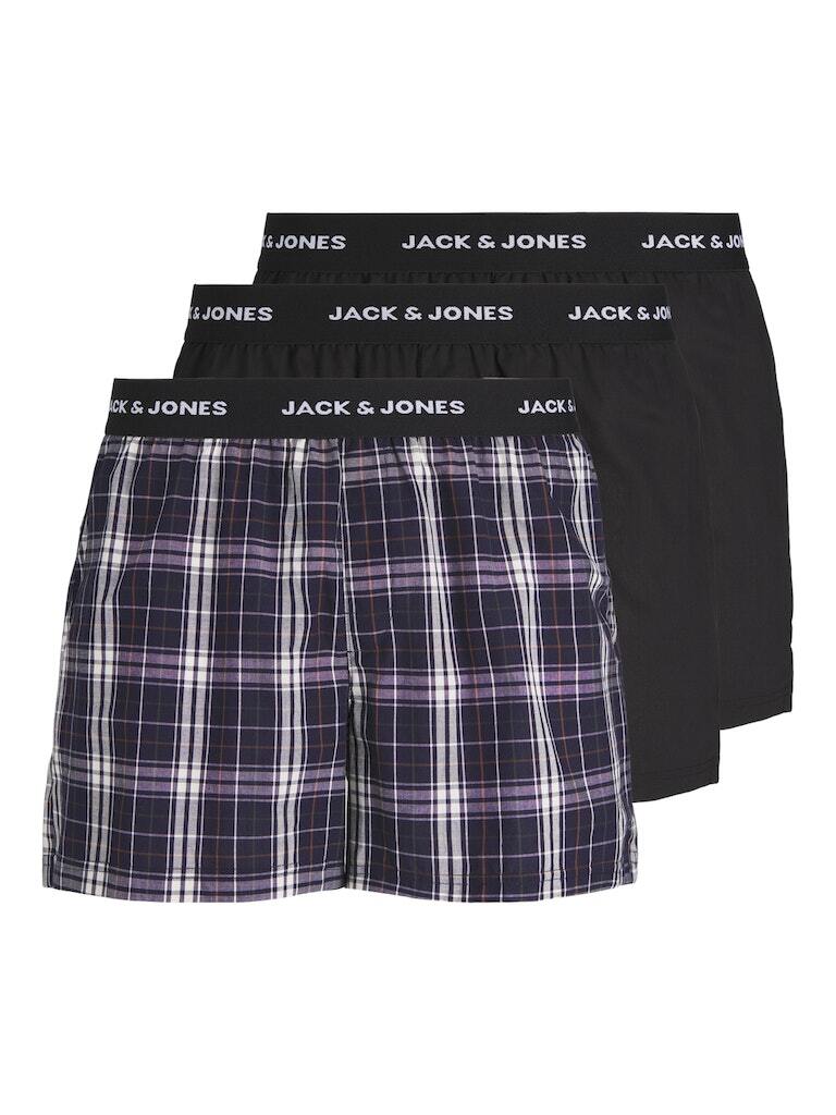 Pakken indeholder 2 x sorte boxershorts + 1 par sort/grå/hvid ternet boxershorts fra Jack & Jones.