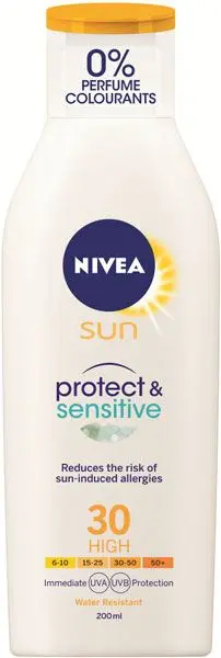 Nivea Sun Protect And Sensitive Lotion beskytter aktivt huden mod solens stråler og solskoldning, da den indeholder både UVA og UVB filtre.