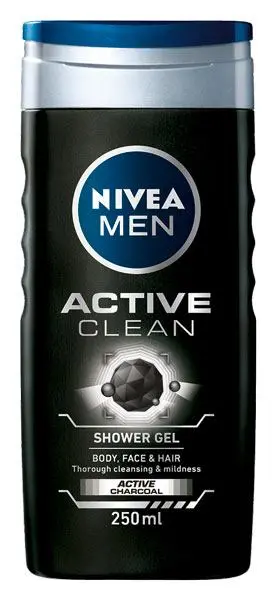 Active Clean Shower Gel fra Nivea har en grå farve, da den indeholder små partikler af kul, som virker eksfolierende.